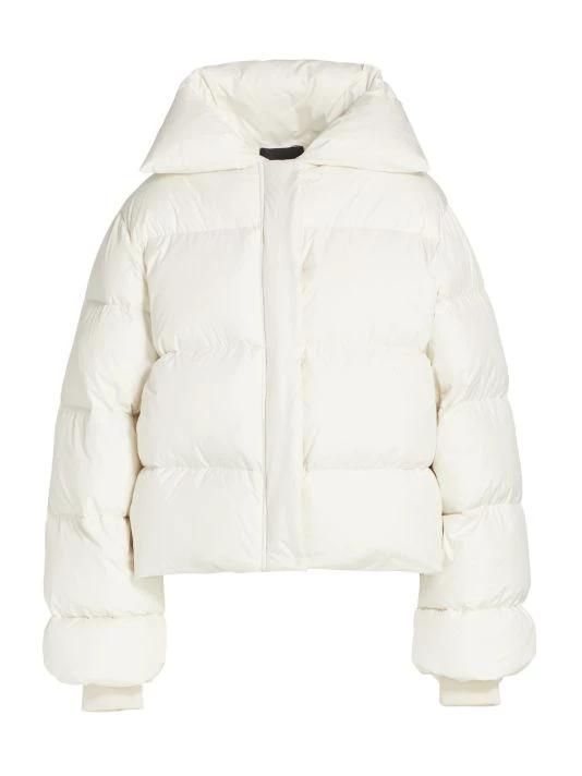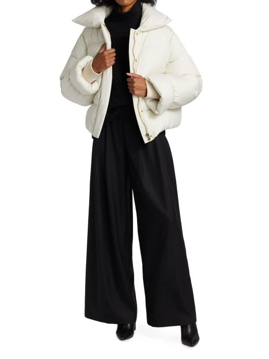 Quilted puffer coat in a cropped silhouette with a defining spread collar.
