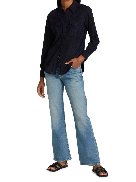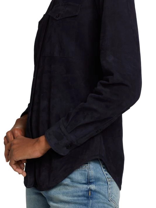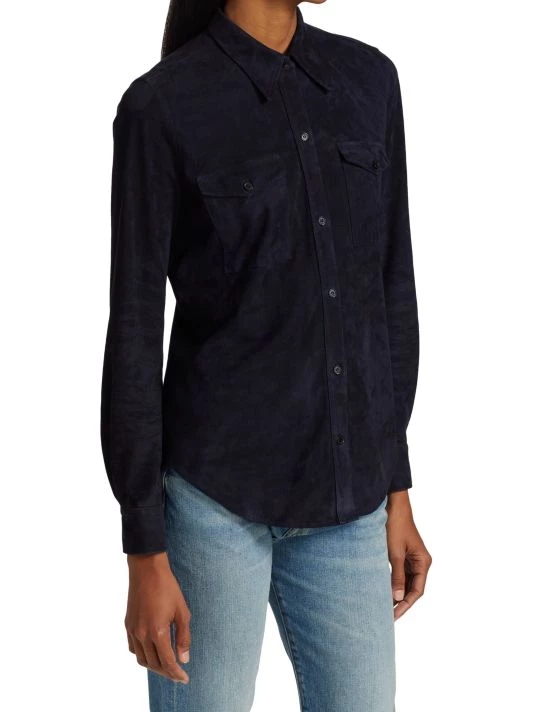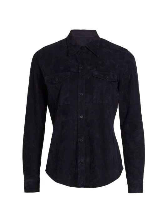 The Ava shirt by Nili Lotan is crafted of lambskin suede. Finished with dual flap pockets, this classic button-front style is detailed with a point collar and long sleeves.