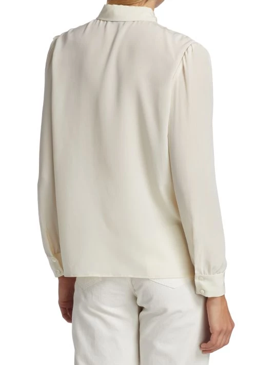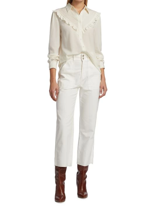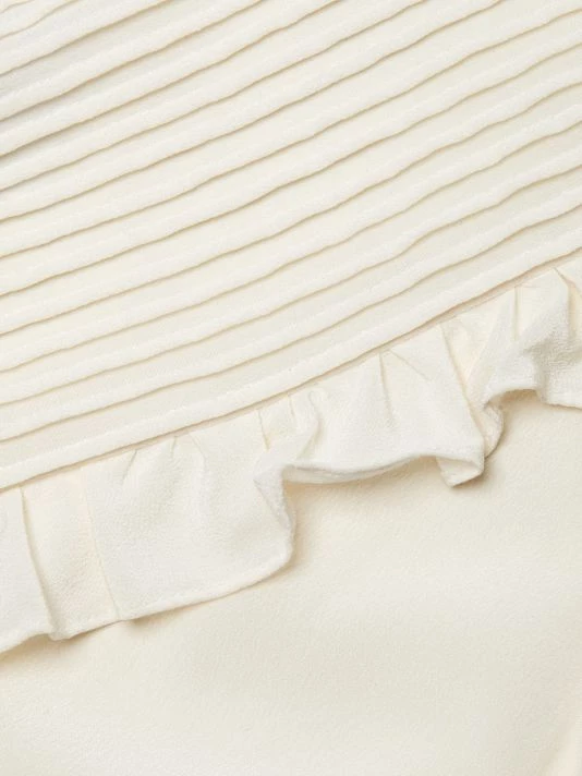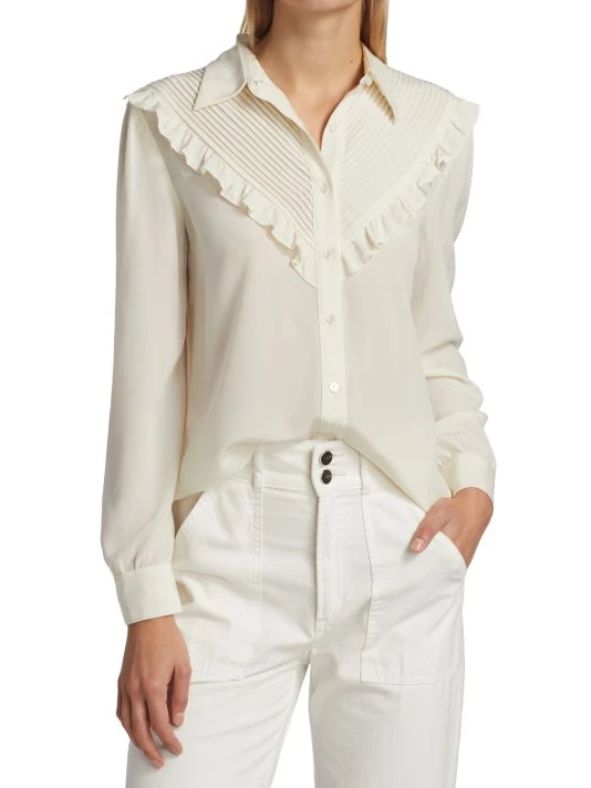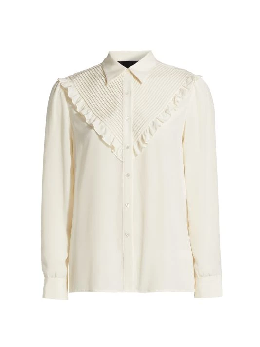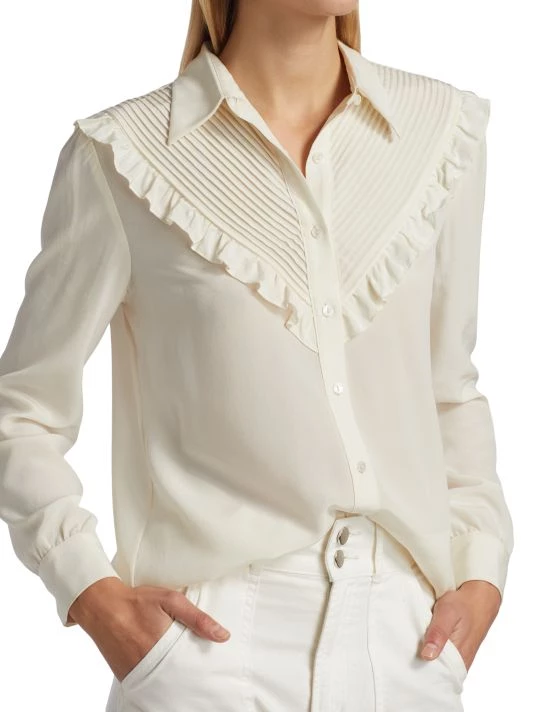 Tailored silk shirt enhanced with a ribbed bib with a romantic ruffle edge.