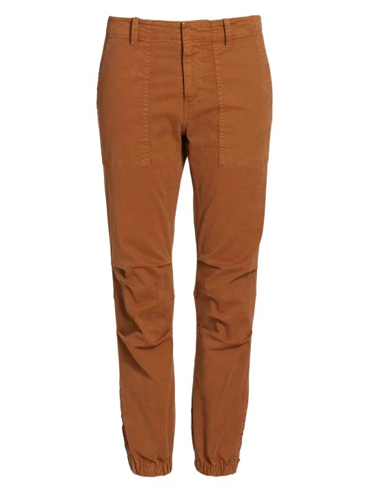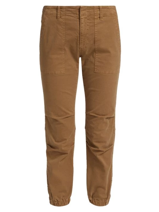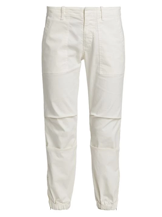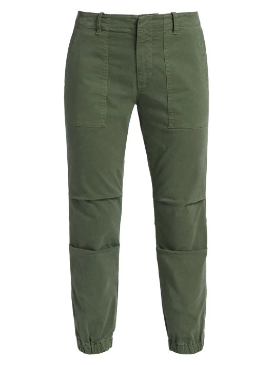 Stretch cotton military pants with utilitarian detailing and a cropped silhouette.